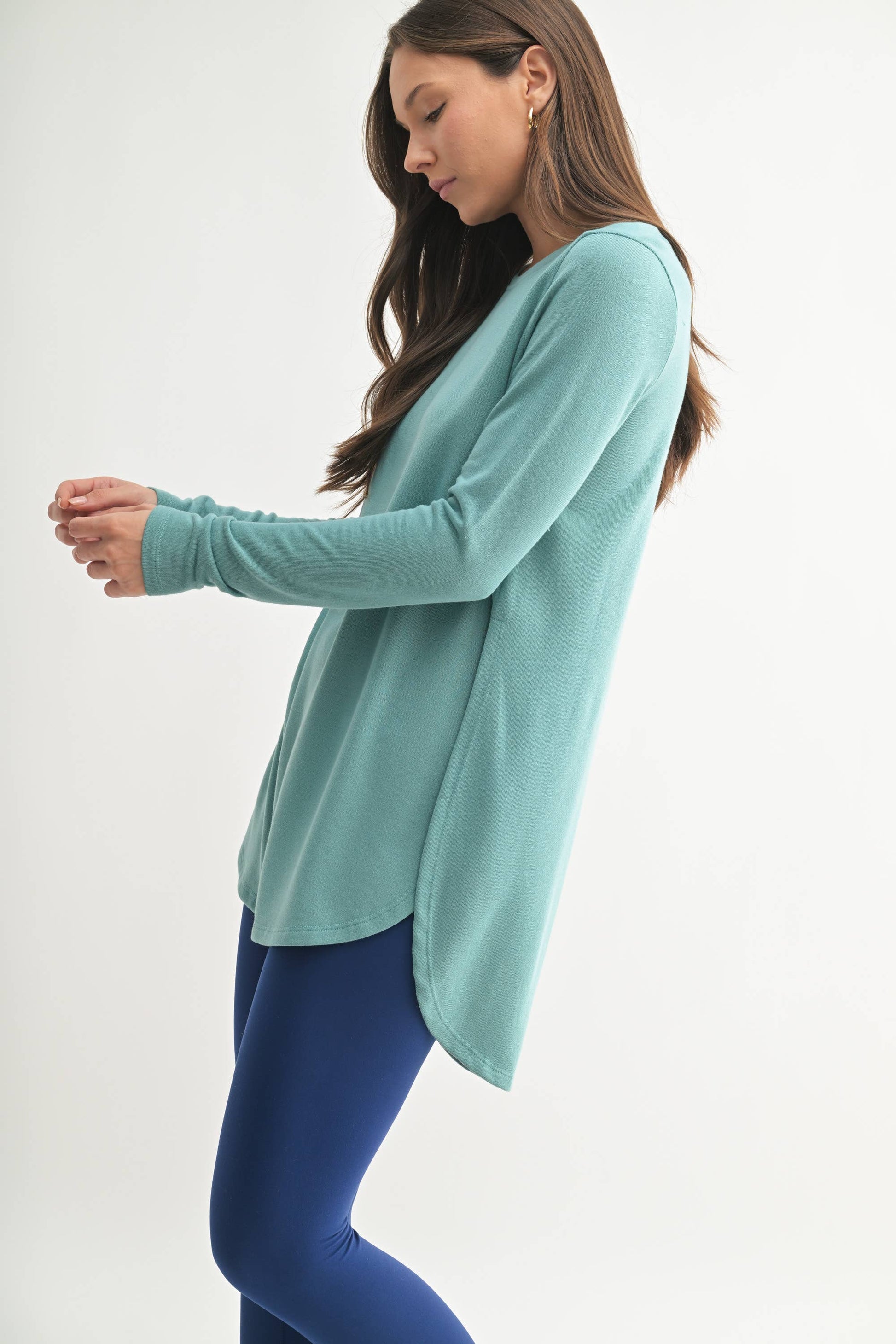 This no-frills long-sleeve top features curved bottom hems and slit on each side that goes all the way up to the hips. We recommend pairing it with leggings or denim pants for an eclectic look.